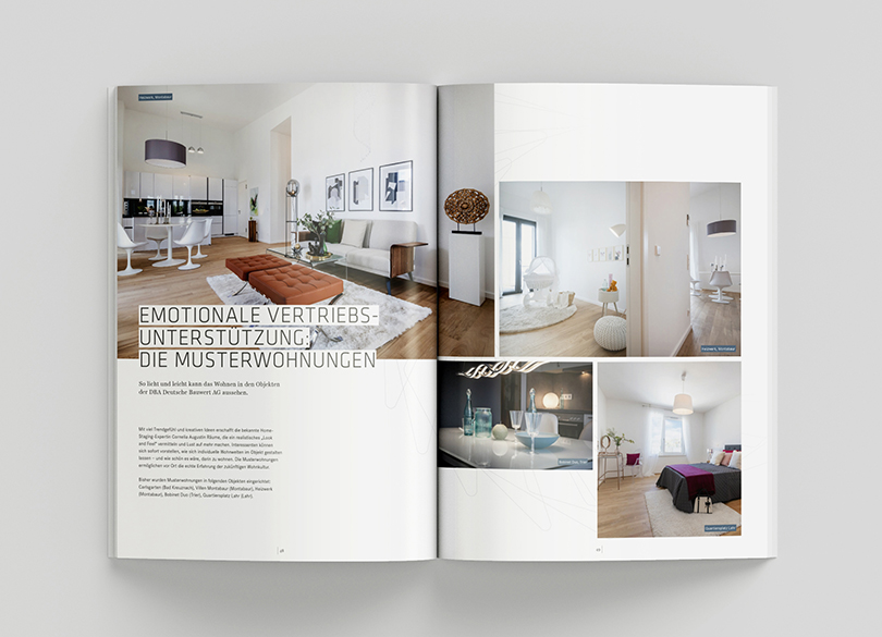 Ein Gebäude ist mehr als ein Grundriss, eine Wohnung mehr als vier Wände und nach Hause zu kommen mehr, als eine Tür aufzuschließen. Für die neue Imagebroschüre unseres Kunden DBA Deutsche Bauwert AG, die zuletzt 2016 aufgelegt wurde, entwickelte das STERN Marketingteam frische Texte und neue Inhalte – zum Beispiel zu den aktuellen Themen ökologische Wohnquartiere, den CITY CUBES – dem neuen, jungen und bezahlbaren Wohnkonzept der DBA – oder auch zum ausgeprägten sozialen Engagement des Kunden. Das Kreativteam der Agentur entwarf darauf abgestimmt einen neuen Look. Die Gestaltung erfolgte in der Corporate Design Handschrift des Unternehmens, wirkt nun mit großformatigen Bildern, zahlreichen Info-Icons und aussagekräftigen Headlines aber noch leichter und lesefreundlicher. So wird die Imagebroschüre die DBA Deutsche Bauwert AG als zentrales Element des Corporate Publishings in den nächsten Jahren begleiten und langfristig nach außen vertreten.