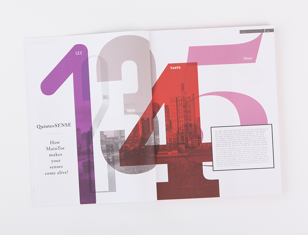 Wie setzt man eine Magazinserie fort, die bereits alle wichtigen Designpreise des Landes gewonnen hat? Man konzentriert sich auf die Quintes SENSE – das Leitthema der fünften Ausgabe des Magazins. Schon heute wohnen und arbeiten rund 1.500 Menschen im MainTor und erfüllen das Ensemble jeden Tag mit Leben. Das aktuelle Magazin THE RIVERSIDE befasst sich mit den fünf essenziellen Sinnen, mit denen wir alle die Welt erleben: See. Smell. Touch. Taste. Hear. Herausgekommen ist ein neues Meisterwerk: mit fantastischen Fotos, coolen Interviews, den neuesten Trends, echten Insidertipps und gestaltet mit Liebe fürs kleinste Detail. Lassen Sie sich entführen in die Welt des MainTor Quartiers. Die Premiere wurde auf der Expo Real 2016 gefeiert.