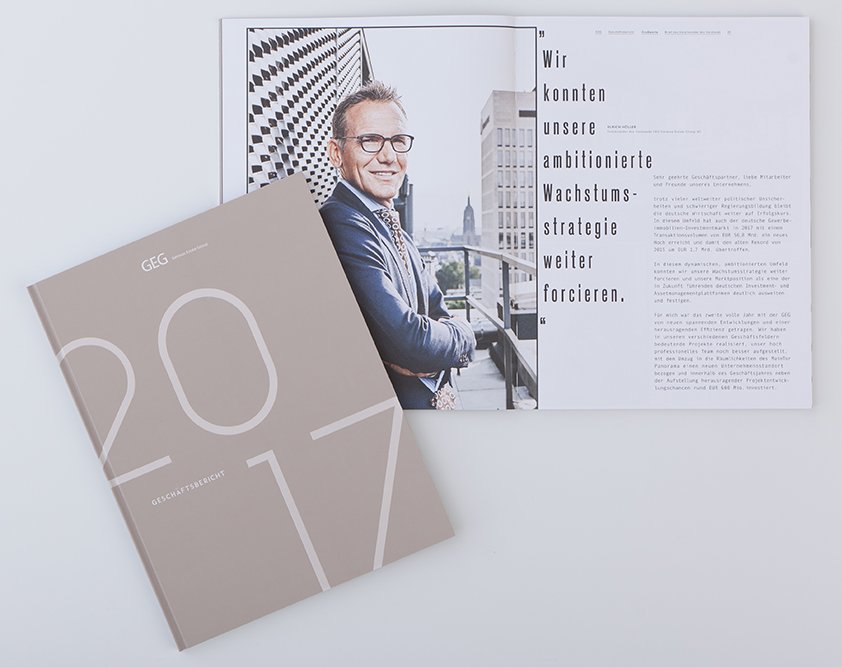 Mit dem Geschäftsbericht 2017 für die German Estate Group hat STERN neue Maßstäbe gesetzt. Der Report über die Aktivitäten des Unternehmens kombiniert Elemente klassischer Geschäftsberichte mit Merkmalen moderner Magazine zu einem einzigartigen Statement im Bereich Unternehmenskommunikation. STERN zeigt auch in diesem Jahr vorbildlich auf, wie sich die Fülle der für den Bericht geforderten Informationen zielgruppengerecht und mit einem hohen Anspruch an klares, aufgeräumtes und doch detailverliebtes und überraschendes Design darstellen lässt. Führende Mitarbeiter der GEG kommen ebenfalls zu Wort und geben dem Geschäftsbericht ein sympathisches Gesicht.