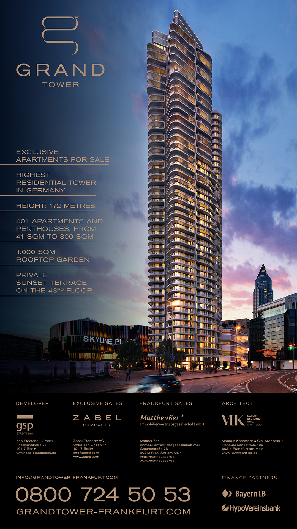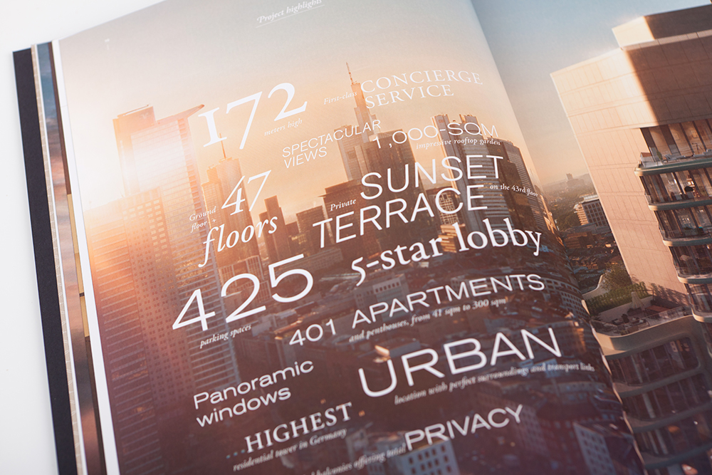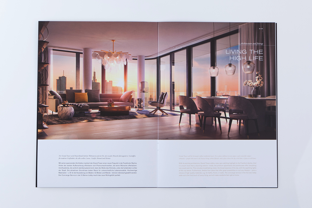Wenn es um Deutschlands höchsten Wohnturm geht, darf auch das Wording unbescheiden daher kommen: Im Grand Tower ist „high life“ Anspruch und Programm. Für den Bauherrn gsp Städtebau und die Immobilienprofis von Zabel Property wurden neben dem Grand Tower Design die Baustellenkommunikation, hochwertige Teaser, eine Microsite, ein Premium-Imagebuch und eine App realisiert. Auch bei der Erstellung der Renderings war STERN beratend und kreativ tätig: Für die wirklichkeitsgetreue Darstellung der Wohnwelten wurde ein aufwändiges Peopleshooting realisiert. Ruhe genießen, Energie tanken – und das im Großstadtdschungel Frankfurt: Ab 2018 ist das im Grand Tower möglich! Wir freuen uns darauf, die weitere Entwicklung des Bauprojekts zu begleiten.