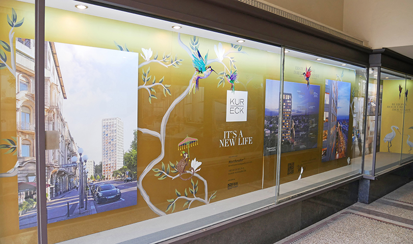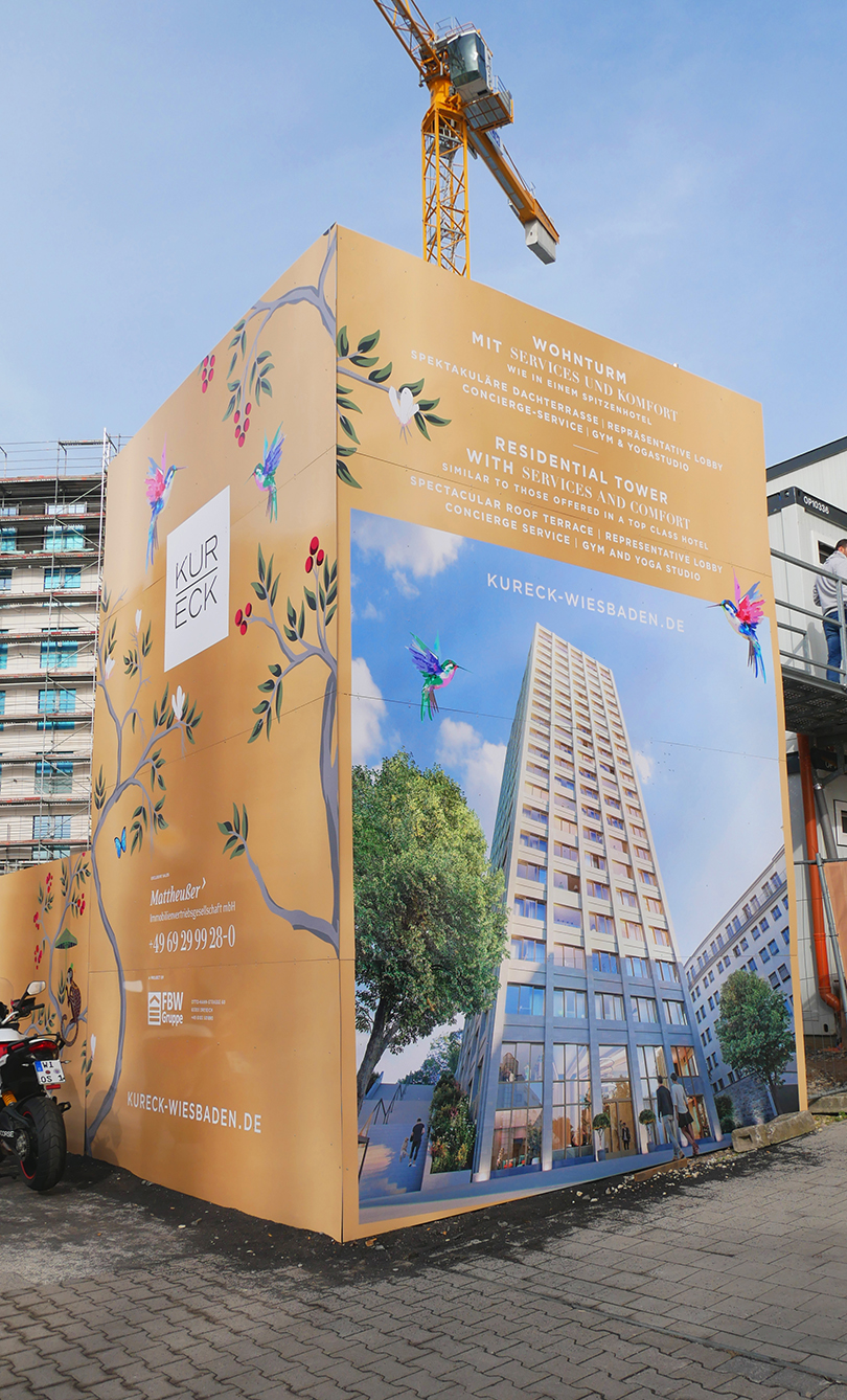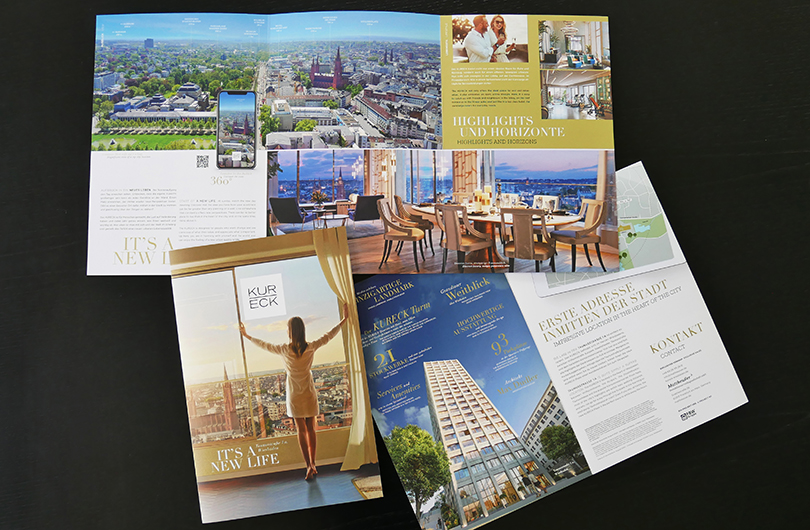 Gut Ding will Weile haben. Schon 2015 haben wir das Design für das Kureck in Wiesbaden entwickelt. Und im Jahr 2019 sind wir für den Auftraggeber FBW Projektbau in die heiße Vermarktungsphase eingestiegen. Mittlerweile gibt es ein Leitbild, das die Strahlkraft des Projekts für die Wiesbadener Innenstadt und die Region widerspiegelt: „It’s a new life“. Das spektakuläre Wohnhochhaus sorgt für viel Aufmerksamkeit in der hessischen Landeshauptstadt, da es mit seiner Exklusivität und den Weitblicken über die Stadt seinesgleichen sucht. Nach Basisarbeiten wie der Entwicklung von Schmuckgrundrissen für alle 66 Wohnungen im Hochhaus, der Einrichtung einer Marketing-Lounge in der Wilhelmstraße und Schaufenstergestaltung im Maklerbüro ging es Schlag auf Schlag im Marketing weiter: Der Teaser ist gedruckt und der Bauzaun sorgt für die nötige Awareness vor Ort. Ein adäquates Marktingtool für die einzigartigen Eigentumswohnungen ist auch das Imagebook. Das STERN Kreativteam hat dafür fünf verschiedene, limitierte und nummerierte Editionen entwickelt – die kunstvoll und aufwendig produzierten Coffeetablebooks versprechen, schon bald beliebte Sammlerstücke zu werden.